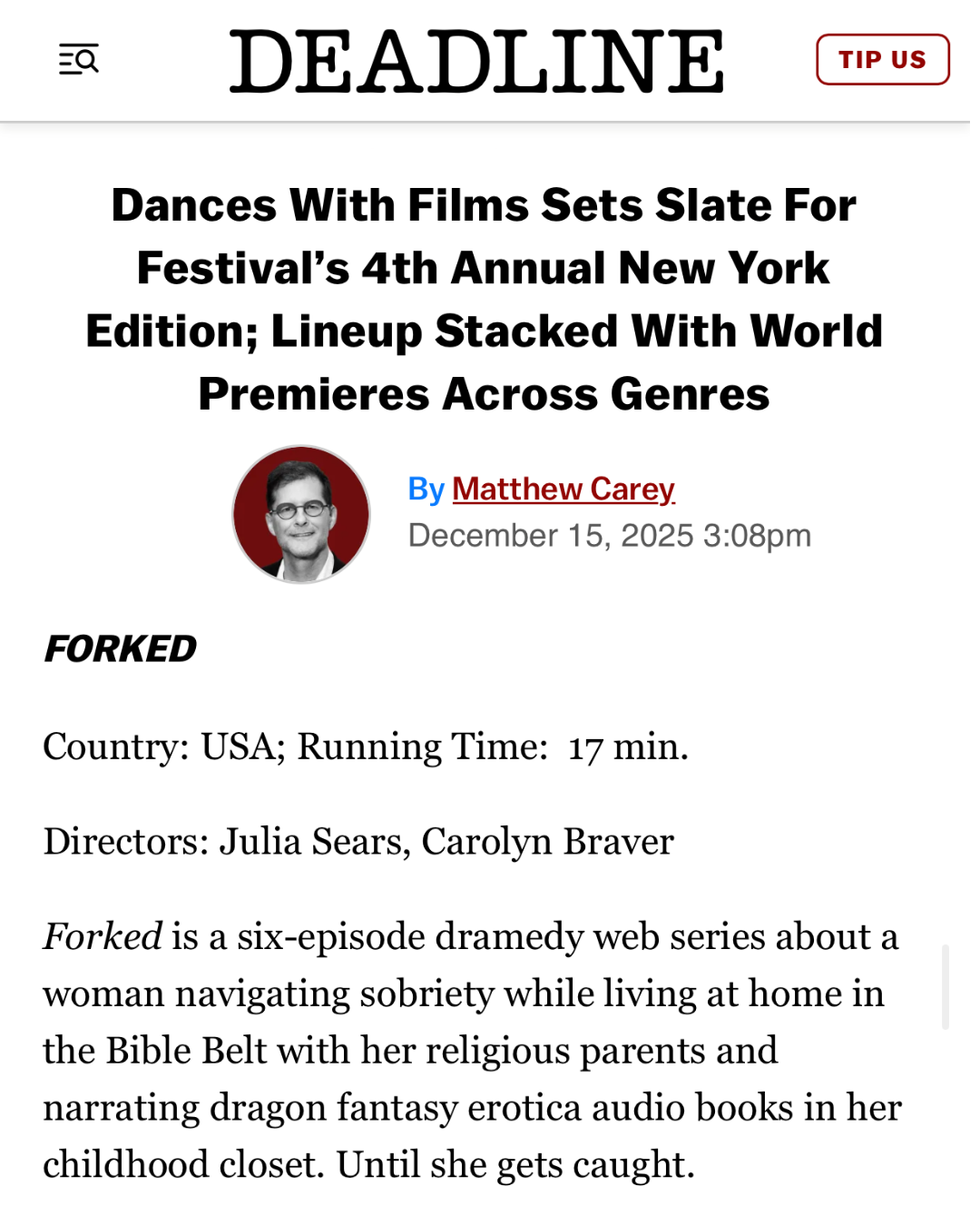 A.A. Cristi covers the upcoming screenings of Sarah Goeke’s award-winning web series Forked, along with the recent award from the Hudson Valley Writers Residency for Goeke to turn the web series into a play.
